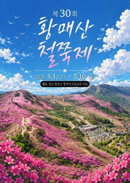 황매산철쭉제는 경상남도 합천군 가회면 소재 황매산군립공원에서 개최되는 봄철 대표 지역 축제이다. 2026년에 열리는 제30회 황매산철쭉제는 5월 1일부터 10일까지 10일간 진행된다. 축제가 열리는 황매산군립공원 철쭉군락지는 전국 최대 규모의 철쭉군락지로, 약 30헥타르(ha)의 면적을 자랑한다. 이곳에 자생하는 철쭉은 산철쭉으로, 일반적인 철쭉이나 진달래와 구별되는 대표적인 한반도 자생종이다. 축제 기간 동안 철쭉과 억새 사이 관광휴게소 부근에서는 나눔카트투어, 도슨트투어, 버스킹 공연, 목재게임 등 다양한 체험 프로그램이 운영된다. 또한 문화 공연과 지역 특산물 장터가 함께 열려 방문객들에게 풍성한 즐길 거리를 제공한다. 황매산철쭉제는 자연경관과 문화체험이 어우러진 봄철 관광 명소로 자리매김하고 있다.